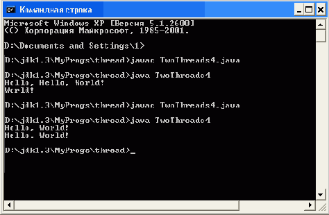 Приведем простейший пример. Метод run о в листинге 17.5 выводит строку "Hello, World!" с задержкой в 1 секунду между словами. Этот метод выполняется двумя подпроцессами, работающими с одним объектом th. Программа выполняется два раза. Первый раз метод run () не синхронизирован, второй раз синхронизирован, его заголовок показан в листинге 17.4 как комментарий. Результат выполнения программы представлен на рис. 17.3.